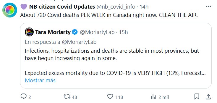 2025 EN INGLÉS En Canadá, en este momento, hay aproximadamente 720 muertes por Covid POR SEMANA. LIMPIA EL AIRE. Posted on enero 21, 2025 por coronado https://x.com/MoriartyLab/status/1881458184193441847