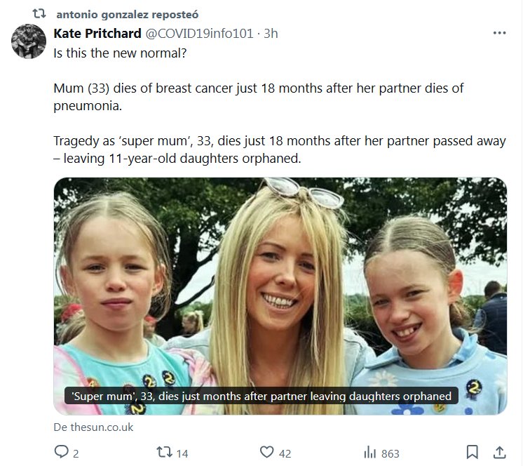 EN INGLÉS Kate Pritchard @COVID19info101 ¿Es esta la nueva normalidad? Una madre (33) muere de cáncer de mama tan solo 18 meses después de que su pareja falleciera de neumonía. Tragedia: una «supermamá» de 33 años muere tan solo 18 meses después de que su pareja falleciera, dejando huérfanas a sus hijas de 11 años.