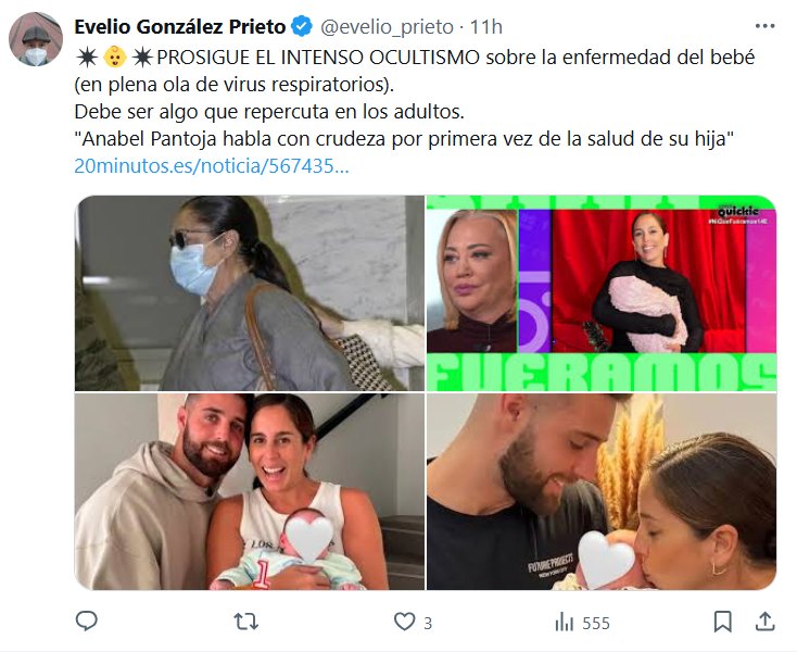 ERA DE OCULTACIÓN DE VIRUS Evelio González Prieto @evelio_prieto · ✴️👶✴️PROSIGUE EL INTENSO OCULTISMO sobre la enfermedad del bebé (en plena ola de virus respiratorios). Debe ser algo que repercuta en los adultos. «Anabel Pantoja habla con crudeza por primera vez de la salud de su hija»