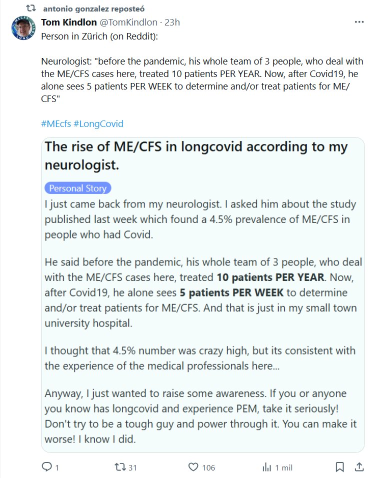 Tom Kindlon @TomKindlon Persona en Zúrich (en Reddit): Neurólogo: «antes de la pandemia, todo su equipo de 3 personas, que se ocupan de los casos de EM/SFC aquí, trataba a 10 pacientes POR AÑO. Ahora, después de la Covid19, él solo ve a 5 pacientes POR SEMANA para determinar y/o tratar a los pacientes con EM/SFC» #EMcfs #CovidProlong