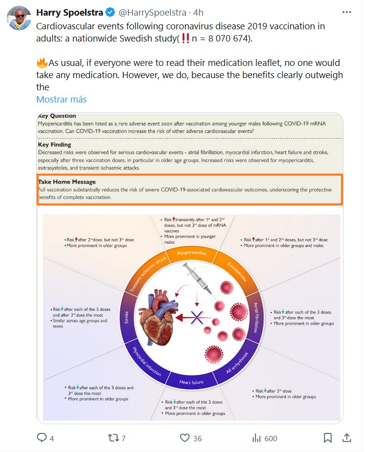 ARNm…ierda! EN INGLÉS Harry Spoelstra @HarrySpoelstra Eventos cardiovasculares tras la vacunación contra la enfermedad por coronavirus 2019 en adultos: un estudio sueco a nivel nacional (‼️n = 8 070 674). 🔥Como siempre, si todos leyeran el prospecto de sus medicamentos, nadie tomaría ningún medicamento. Sin embargo, lo hacemos, ¡porque los beneficios superan claramente los riesgos potenciales!