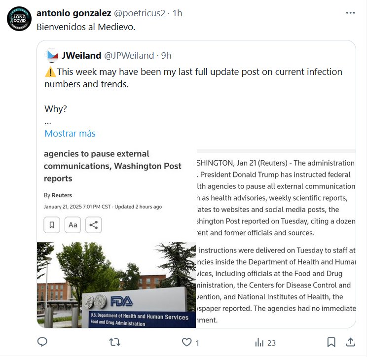 CON TRAMP, COVID&CIA PARA TODOS? antonio gonzalez @poetricus2 · Bienvenidos al Medievo : EN INGLÉS JWeiland @JPWeiland ⚠️Esta semana puede haber sido mi última publicación de actualización completa sobre las cifras y tendencias de infección actuales. ¿Por qué? La nueva administración puede pausar todos los informes públicos de datos de salud federales de la FDA, los CDC y el DHS, según este artículo.