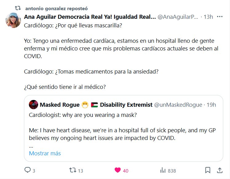 SIGUEN CON GASLIGHTING Ana Aguilar Democracia Real Ya! Igualdad Real Ya! @AnaAguilarPAC · Cardiólogo: ¿Por qué llevas mascarilla? Yo: Tengo una enfermedad cardíaca, estamos en un hospital lleno de gente enferma y mi médico cree que mis problemas cardíacos actuales se deben al COVID. Cardiólogo: ¿Tomas medicamentos para la ansiedad? ¿Qué sentido tiene ir al médico?