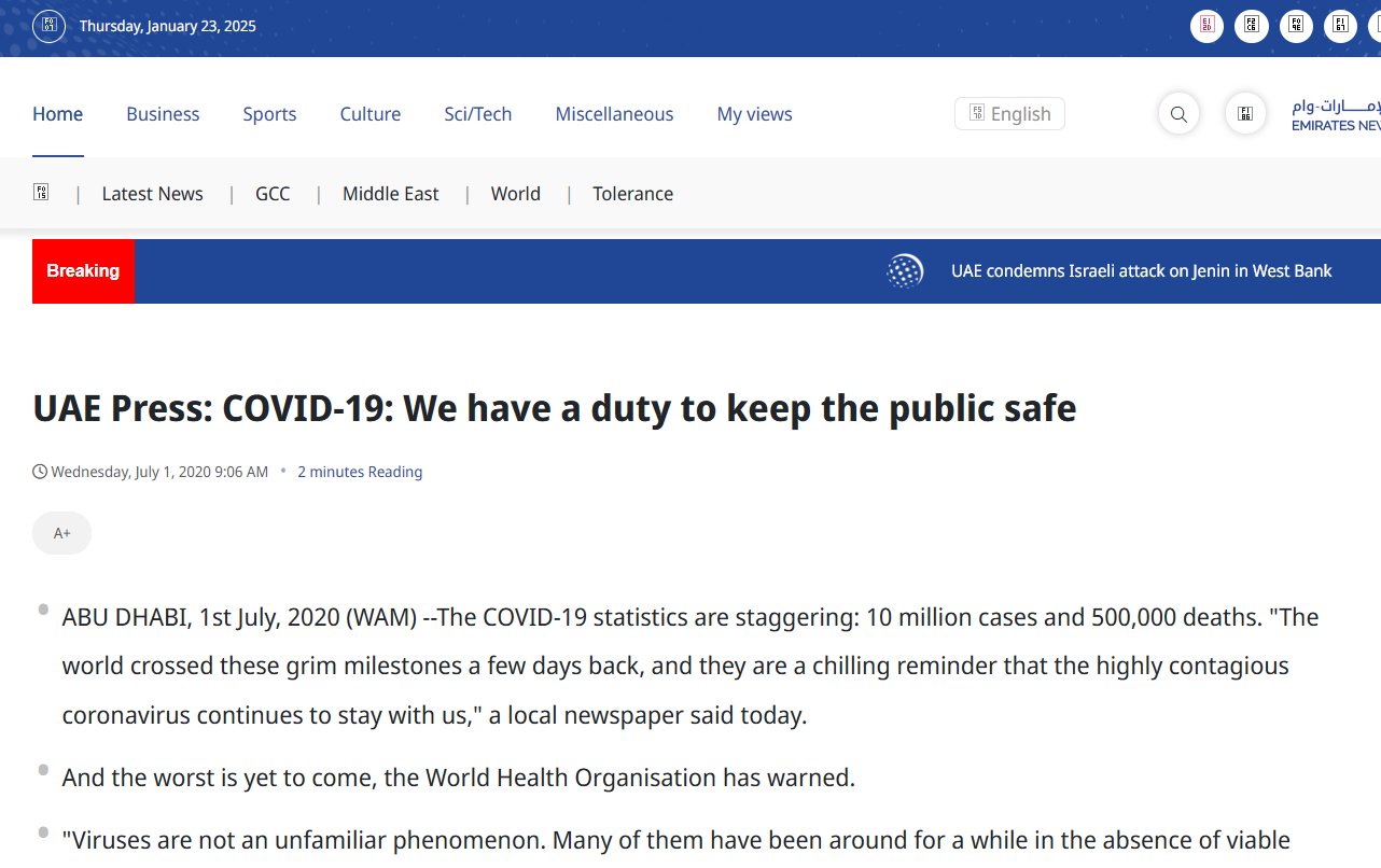 EN INGLÉS Prensa de los EAU: COVID-19: Tenemos el deber de mantener la seguridad pública Las estadísticas de COVID-19 son asombrosas: 10 millones de casos y 500.000 muertes. «El mundo cruzó estos sombríos hitos hace unos días y son un escalofriante recordatorio»