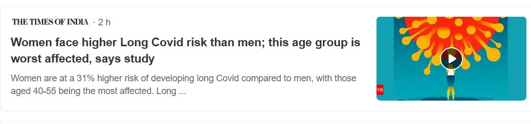 EN INGLÉS Las mujeres corren un mayor riesgo de padecer Covid prolongado que los hombres; este grupo de edad es el más afectado, según un estudio Posted on enero 24, 2025 por coronado https://timesofindia.indiatimes.com/life-style/health-fitness/health-news/women-face-higher-long-covid-risk-than-men-this-age-group-is-worst-affected-says-study/articleshow/117522237.cms