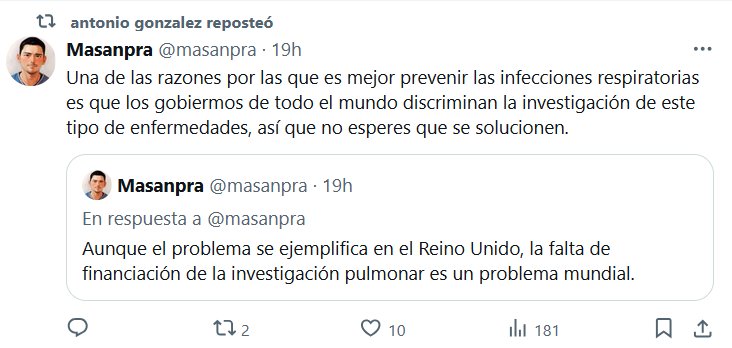 ESCUCHO VOCES QUE SON GRITOS antonio gonzalez reposteó Masanpra @masanpra · 19h Una de las razones por las que es mejor prevenir las infecciones respiratorias es que los gobiermos de todo el mundo discriminan la investigación de este tipo de enfermedades, así que no esperes que se solucionen