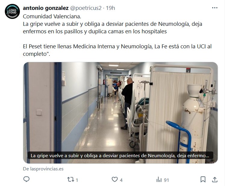 MENOS MAL QUE NO HAY COVID! Comunidad Valenciana. La gripe vuelve a subir y obliga a desviar pacientes de Neumología, deja enfermos en los pasillos y duplica camas en los hospitales Posted on enero 24, 2025 por coronado