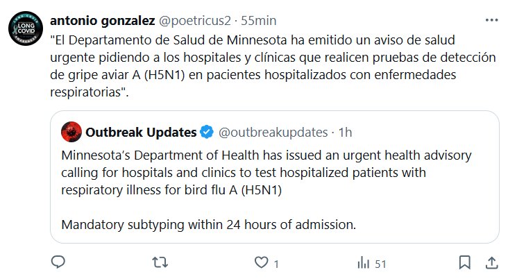 PARAPANDEMIA-SS POSTPANDÉMICAS «El Departamento de Salud de Minnesota ha emitido un aviso de salud urgente pidiendo a los hospitales y clínicas que realicen pruebas de detección de gripe aviar A (H5N1) en pacientes hospitalizados con enfermedades respiratorias».