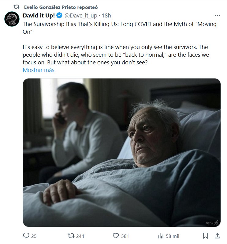 El sesgo de supervivencia que nos está matando: la COVID prolongada y el mito de “seguir adelante” Es fácil creer que todo está bien cuando solo ves a los sobrevivientes. Las personas que no murieron, que parecen haber vuelto a la normalidad, son los rostros en los que nos centramos. Pero ¿qué pasa con los que no vemos? El compañero de trabajo que no ha vuelto a la oficina. El amigo que parece que ya nunca hace planes. El padre que solía hacer malabarismos con todo pero ahora lucha por superar el día. Son millones de personas las que sufren a causa de la COVID-19 prolongada. Su ausencia es tan ruidosa como invisible. Y, sin embargo, como están fuera de la vista, pretendemos que no forman parte de la historia. El sesgo de supervivencia (la tendencia a centrarse solo en quienes parecen haber "superado la enfermedad") ha moldeado la forma en que hablamos sobre la COVID-19 y está distorsionando la verdad. La verdad es que ninguno de nosotros está bien. Ni con las infecciones repetidas, ni con ignorar las consecuencias a largo plazo, y ciertamente no con la decisión de la Administración Trump de amordazar a los Institutos Nacionales de Salud (NIH) en relación con las investigaciones sobre la COVID prolongada. El sesgo de supervivencia en acción: el mito de la “recuperación” Vemos a personas que vuelven a trabajar, a viajar, a vivir sus vidas y asumimos que el peligro ha pasado. Pero el sesgo de supervivencia nos impide ver a los millones de personas que no pueden participar en este supuesto regreso a la normalidad. Por cada persona que “se recupera”, hay otra que nunca lo hace, o que va acumulando daños en silencio con cada reinfección. Las infecciones repetidas de COVID-19 no desaparecen sin consecuencias. Cada una de ellas te hace envejecer a nivel celular y deja cicatrices en el cerebro, el corazón y el sistema inmunológico. Puede que pienses que estás bien porque sigues en pie, pero el sesgo de supervivencia te ha engañado para que ignores las grietas que se forman debajo de la superficie. Las personas que contraen la segunda, quinta o décima infección están empezando a experimentar cosas que nunca habían esperado: ataques cardíacos repentinos, accidentes cerebrovasculares, enfermedades autoinmunes. Se sienten más distraídos, inquietos e incapaces de concentrarse: síntomas de que las células generadoras de dopamina en el cerebro están dañadas. Se están dando cuenta de que ser un "sobreviviente" no significa salir ileso. Este sesgo no solo distorsiona nuestra percepción de lo que hace la COVID-19, sino que también alimenta la complacencia. Nos permite creer que lo peor ya pasó, cuando en realidad el daño continúa y se agrava. La mayoría invisible: los pacientes con COVID-19 prolongado se quedan atrás Para los millones de personas que sufren de COVID-19 prolongado, el sesgo de supervivencia es como una forma de borrar la realidad. La sociedad ha seguido adelante, celebrando su “victoria” sobre el virus mientras ignora a quienes nunca se recuperaron