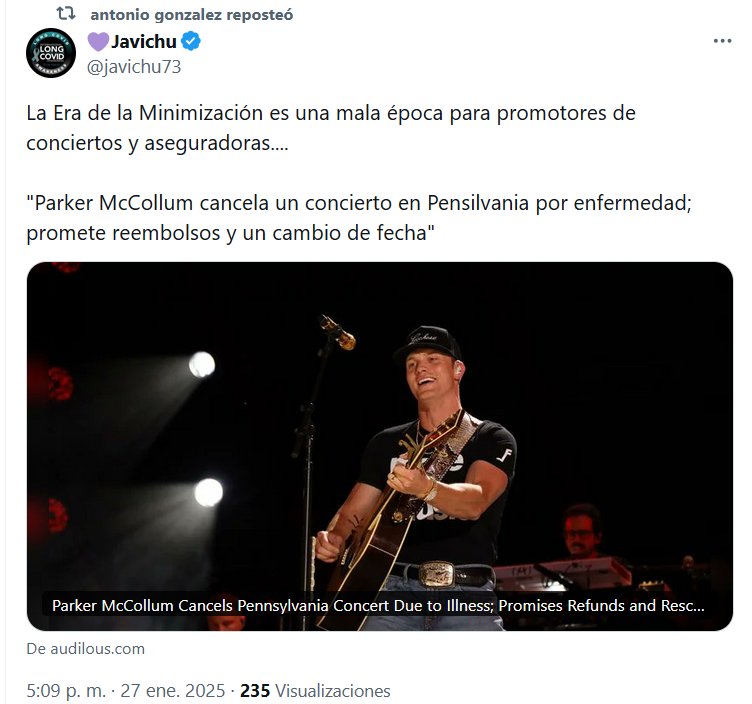 A NADIE LE IMPORTA SU SALUD? SON TODOS VALIENTES O ESTÚPIDOS? La Era de la Minimización es una mala época para promotores de conciertos y aseguradoras…. «Parker McCollum cancela un concierto en Pensilvania por enfermedad; promete reembolsos y un cambio de fecha»
