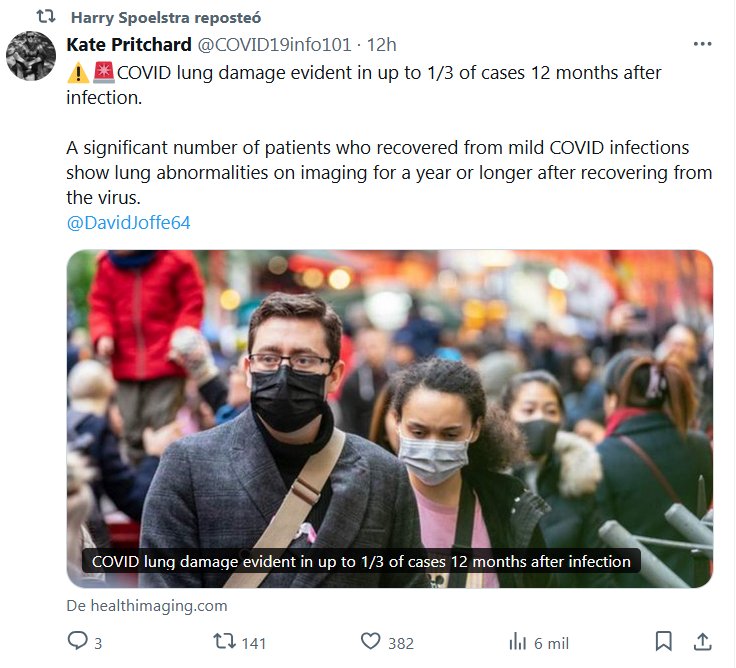 EN INGLÉS Harry Spoelstra reposteó Kate Pritchard @COVID19info101 ⚠️🚨El daño pulmonar por COVID es evidente en hasta 1/3 de los casos 12 meses después de la infección. Una cantidad significativa de pacientes que se recuperaron de infecciones leves por COVID muestran anomalías pulmonares en las imágenes durante un año o más después de recuperarse del virus. @DavidJoffe64