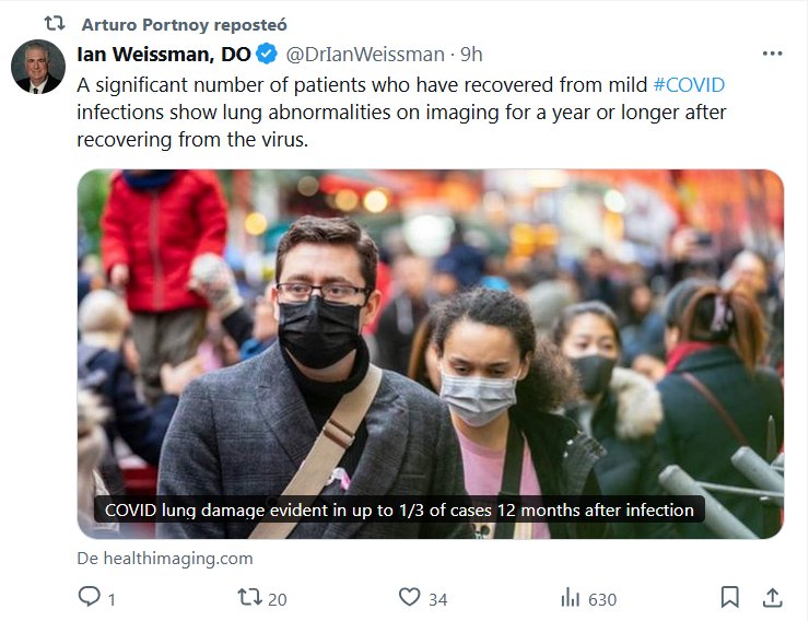 EN INGLÉS Ian Weissman, DO @DrIanWeissman Una cantidad significativa de pacientes que se han recuperado de infecciones leves por #COVID-19 muestran anomalías pulmonares en las imágenes durante un año o más después de recuperarse del virus