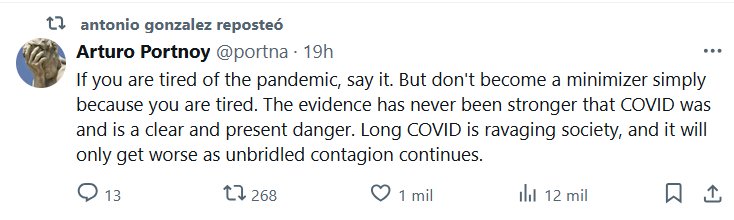 EN INGLÉS Arturo Portnoy @portna Si estás cansado de la pandemia, dilo. Pero no te conviertas en un minimizador simplemente porque estás cansado. La evidencia nunca ha sido más contundente de que el COVID era y es un peligro claro y presente. El COVID prolongado está devastando la sociedad y solo empeorará a medida que continúe el contagio desenfrenado.
