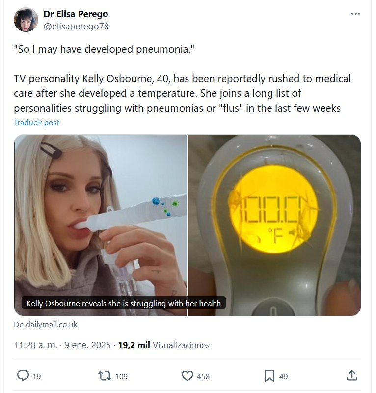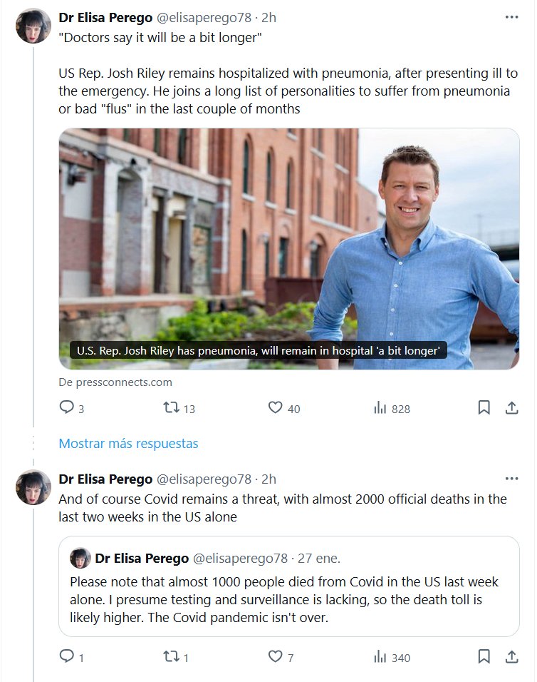 EN INGLÉS Dra. Elisa Perego @elisaperego78 Los médicos dicen que tardará un poco más» El diputado estadounidense Josh Riley sigue hospitalizado por neumonía, tras presentarse enfermo en urgencias. Se suma a una larga lista de personalidades que han sufrido neumonía o «gripes» graves en los últimos meses Y, por supuesto, el Covid sigue siendo una amenaza, con casi 2000 muertes oficiales en las últimas dos semanas solo en Estados Unidos.