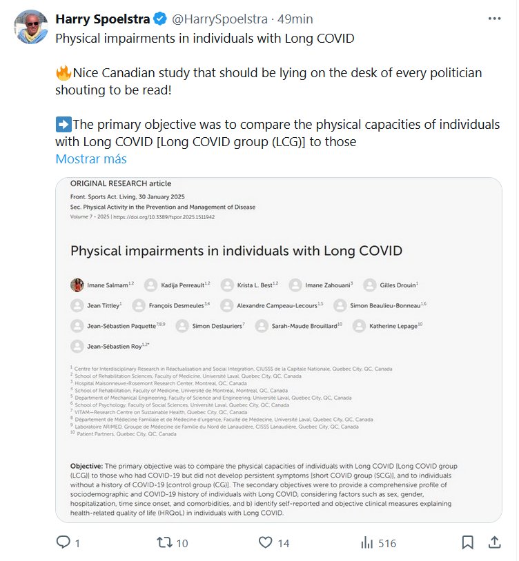 EN INGLÉS Harry Spoelstra @HarrySpoelstra Discapacidades físicas en personas con COVID prolongada 🔥¡Buen estudio canadiense que debería estar sobre el escritorio de cada político pidiendo a gritos que lo lea! ➡️El objetivo principal era comparar las capacidades físicas de las personas con COVID prolongada [grupo COVID prolongada (LCG)] con las de las personas con COVID prolongada