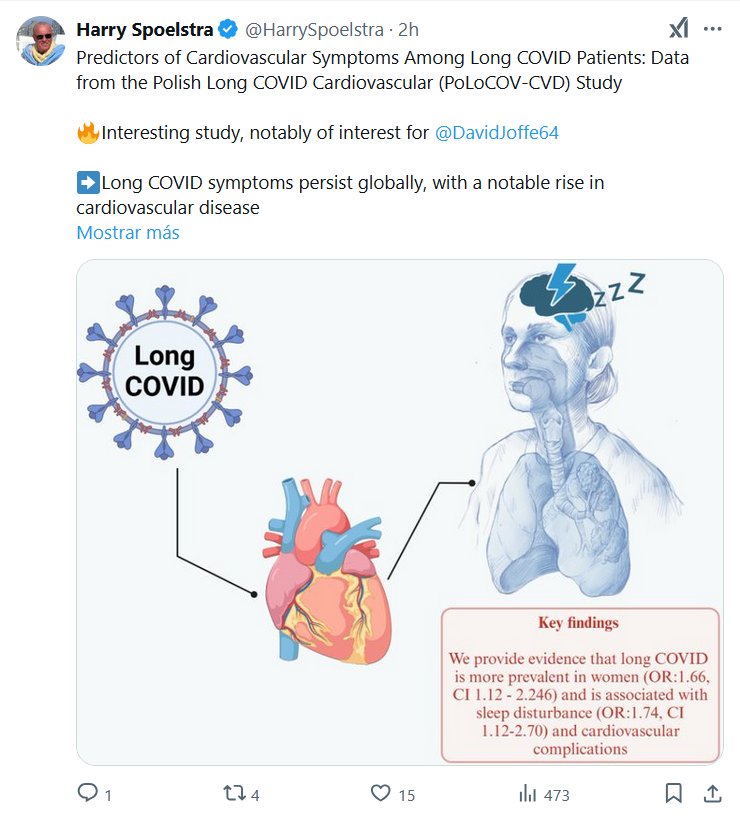 NUNCA FUE LEVE Harry Spoelstra @HarrySpoelstra Predictores de síntomas cardiovasculares entre pacientes con COVID-19 prolongado: datos del estudio polaco sobre COVID-19 prolongado cardiovascular (PoLoCOV-CVD) 🔥Estudio interesante, de especial interés para @DavidJoffe64 ➡️Los síntomas de COVID-19 prolongado persisten en todo el mundo, con un notable aumento de las enfermedades cardiovasculares