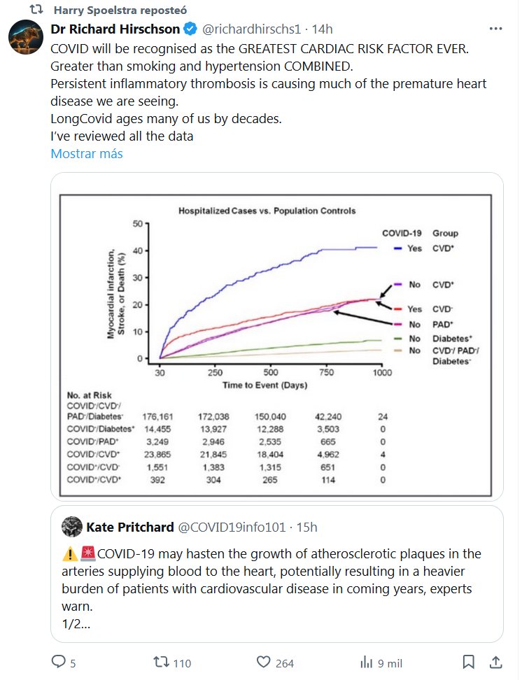 EN INGLÉS Harry Spoelstra reposteó Dr. Richard Hirschson @richardhirschs1 Se reconocerá que la COVID es el MAYOR FACTOR DE RIESGO CARDÍACO DE TODOS LOS TIEMPOS. Mayor que el tabaquismo y la hipertensión COMBINADOS. La trombosis inflamatoria persistente está causando gran parte de la enfermedad cardíaca prematura que estamos viendo. La COVID prolongada envejece a muchos de nosotros décadas. He revisado todos los datos