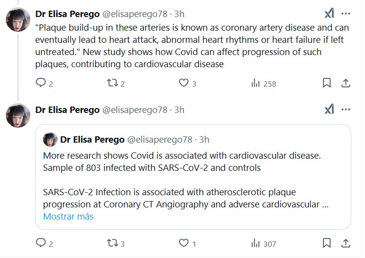 EN INGLÉS Dra. Elisa Perego @elisaperego78 «La COVID-19 puede acelerar el crecimiento de las placas ateroscleróticas en las arterias que suministran sangre al corazón, lo que podría provocar una mayor carga de pacientes con enfermedades cardiovasculares en los próximos años, advierten los expertos»