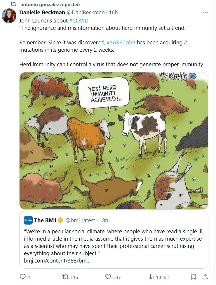 EN INGLÉS John Launer sobre el #COVID: «La ignorancia y la desinformación sobre la inmunidad de grupo marcan una tendencia». Recuerde: desde que se descubrió, el #SARSCoV2 ha estado adquiriendo 2 mutaciones en su genoma cada 2 semanas. La inmunidad de grupo no puede controlar un virus que no genera la inmunidad adecuada.