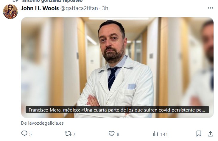 LOS MINIMIZADORES SON CRIMINALES antonio gonzalez reposteó John H. Wools @gattaca2titan Francisco Mera, médico: «Una cuarta parte de los que sufren covid persistente perdieron el trabajo» Posted on febrero 6, 2025 por coronado https://www.lavozdegalicia.es/noticia/lugo/2025/02/05/francisco-mera-medico-85-sufren-covid-persistente-pueden-volver-trabajo-/00031738749495808401276.htm