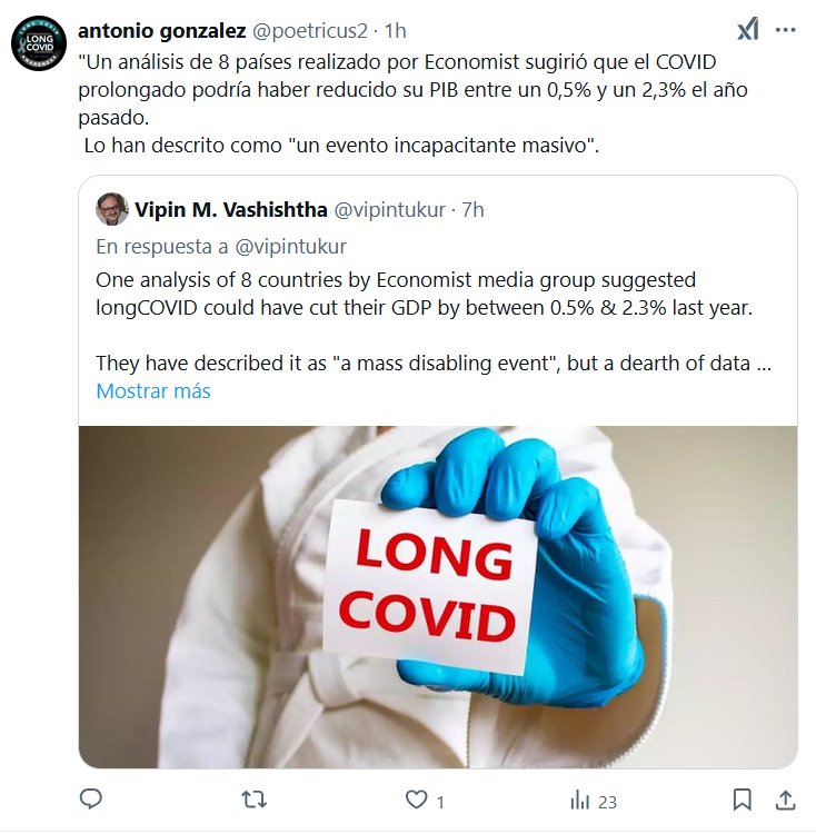 «Un análisis de 8 países realizado por Economist sugirió que el COVID prolongado podría haber reducido su PIB entre un 0,5% y un 2,3% el año pasado. Lo han descrito como «un evento incapacitante masivo»