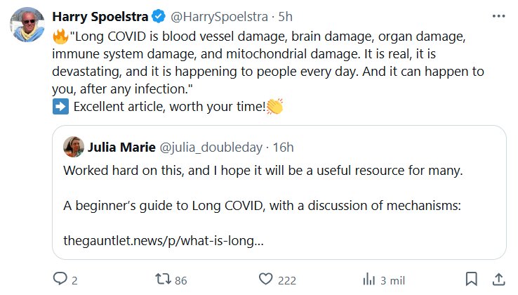 EN INGLÉS Harry Spoelstra @HarrySpoelstra 🔥»La COVID prolongada causa daños en los vasos sanguíneos, el cerebro, los órganos, el sistema inmunológico y las mitocondrias. Es real, devastador y le sucede a la gente todos los días. Y te puede pasar a ti después de cualquier infección». ➡️ ¡Excelente artículo, vale la pena leerlo! 👏