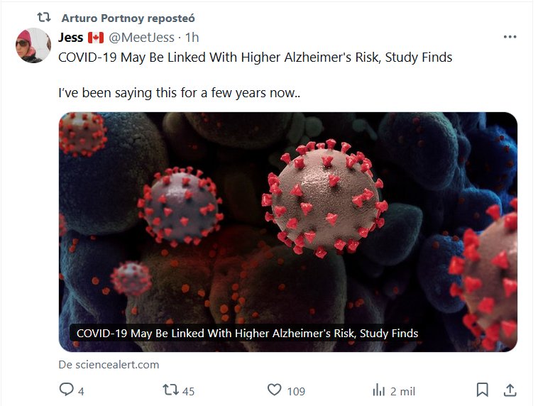EN INGLÉS Un estudio revela que la COVID-19 podría estar relacionada con un mayor riesgo de padecer Alzheimer Llevo diciendo esto desde hace unos años… Posted on febrero 8, 2025 por coronado https://www.sciencealert.com/covid-19-may-be-linked-with-higher-alzheimers-risk-study-finds
