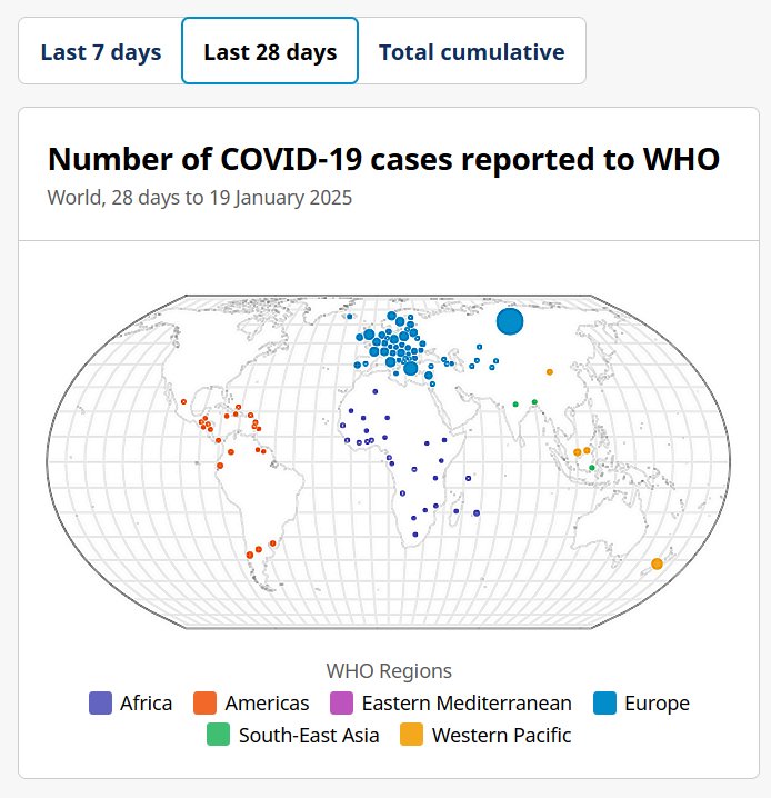 LOS NO REPORTADOS NO LOS MUESTRAN (EN INGLÉS) Número de casos de COVID-19 notificados a la OMS > Mundo, 28 días al 19 de enero de 2025 Posted on febrero 8, 2025 por coronado COMO SE PUEDE OBSERVAR EL "FIN DE PANDEMIA" SE RESISTE EN TODOS LOS CONTINENTES, Y ESTOS SON SOLO LOS CASOS "INFORMADOS"