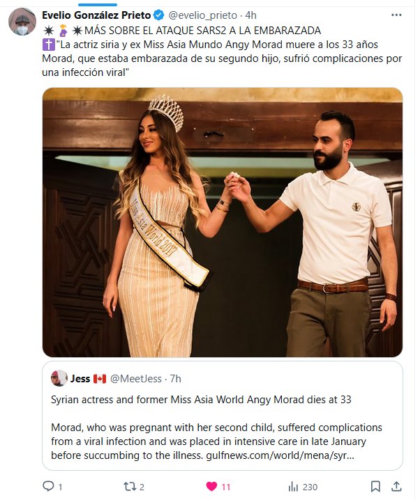 Evelio González Prieto @evelio_prieto · 4h ✴️🤰✴️MÁS SOBRE EL ATAQUE SARS2 A LA EMBARAZADA ✝️»La actriz siria y ex Miss Asia Mundo Angy Morad muere a los 33 años Morad, que estaba embarazada de su segundo hijo, sufrió complicaciones por una infección viral»