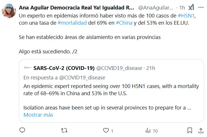 PANDEMIA 2.0? Ana Aguilar Democracia Real Ya! Igualdad Real Ya! @AnaAguilarPAC · 1h Un experto en epidemias informó haber visto más de 100 casos de #H5N1, con una tasa de #mortalidad del 69% en #China y del 53% en los EE.UU. Se han establecido áreas de aislamiento en varias provincias Algo está sucediendo