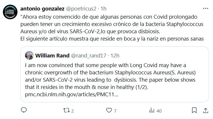 «Ahora estoy convencido de que algunas personas con Covid prolongado pueden tener un crecimiento excesivo crónico de la bacteria Staphylococcus Aureus y/o del virus SARS-CoV-2,lo que provoca disbiosis. El siguiente artículo muestra que reside en boca y la nariz en personas sanas