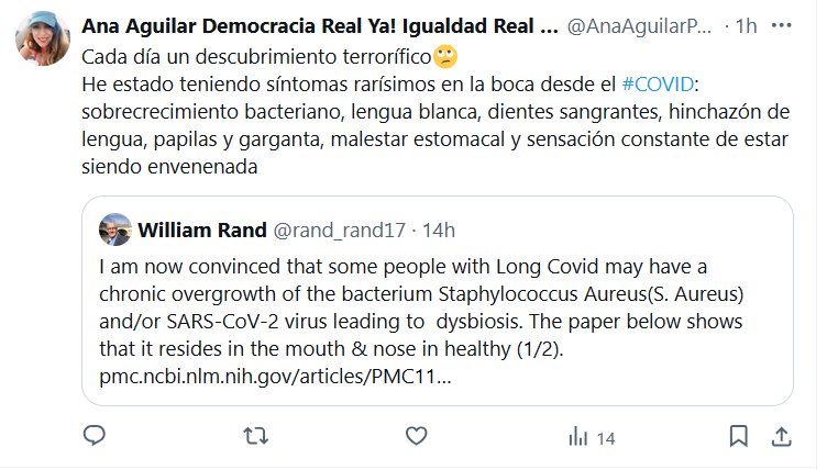 Ana Aguilar Democracia Real Ya! Igualdad Real Ya! @AnaAguilarPAC Cada día un descubrimiento terrorífico🙄 He estado teniendo síntomas rarísimos en la boca desde el #COVID: sobrecrecimiento bacteriano, lengua blanca, dientes sangrantes, hinchazón de lengua, papilas y garganta, malestar estomacal y sensación constante de estar siendo envenenada