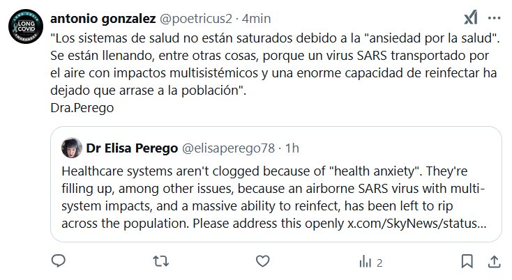 «Los sistemas de salud no están saturados debido a la «ansiedad por la salud». Se están llenando, entre otras cosas, porque un virus SARS transportado por el aire con impactos multisistémicos y una enorme capacidad de reinfectar ha dejado que arrase a la población». Dra.Perego