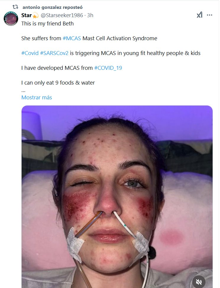 TESTIMONIOS He desarrollado MCAS a partir de #COVID_19 Solo puedo comer 9 alimentos y agua. Beth ahora no puede comer nada por boca debido a que es alérgica a todos los alimentos.