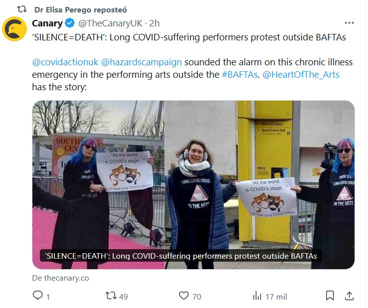 EN INGLÉS La Dra. Elisa Perego reposteó Canary @TheCanaryUK ‘SILENCIO=MUERTE’: Artistas que sufren mucho COVID-19 protestan fuera de los BAFTA @covidactionuk @hazardscampaign dio la voz de alarma sobre esta emergencia de enfermedad crónica en las artes escénicas fuera de los #BAFTA. @HeartOfThe_Arts tiene la historia