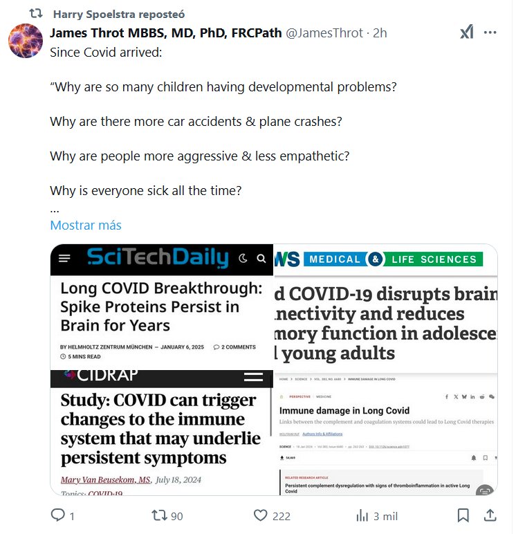 QUESTIONS (EN INGLÉS) Harry Spoelstra reposteó James Throt MBBS, MD, PhD, FRCPath @JamesThrot Desde que llegó el Covid: “¿Por qué tantos niños tienen problemas de desarrollo? ¿Por qué hay más accidentes automovilísticos y de avión? ¿Por qué las personas son más agresivas y menos empáticas? ¿Por qué todo el mundo está enfermo todo el tiempo?