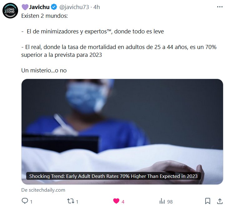 CEGUERA TEMPORAL (DEL COMIENZO DE LA PANDEMIA HASTA HOY) 💜Javichu @javichu73 · Existen 2 mundos: – El de minimizadores y expertos™, donde todo es leve – El real, donde la tasa de mortalidad en adultos de 25 a 44 años, es un 70% superior a la prevista para 2023 Un misterio…o no