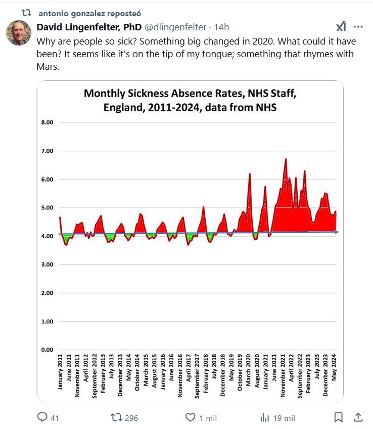 EN INGLÉS DR. David Lingenfelter, PhD @dlingenfelter ¿Por qué la gente está tan enferma? Algo importante cambió en 2020. ¿Qué pudo haber sido? Parece que lo tengo en la punta de la lengua; algo que rima con «MARS» [SARS]
