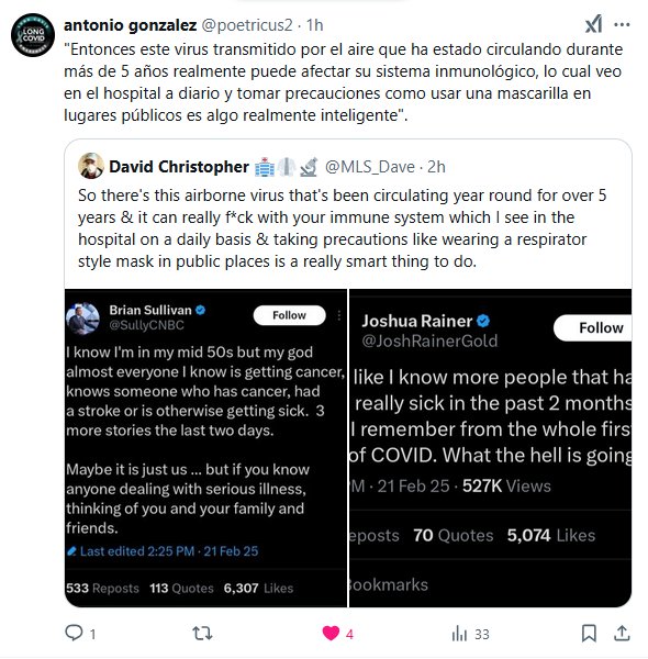 «Entonces este virus transmitido por el aire que ha estado circulando durante más de 5 años realmente puede afectar su sistema inmunológico, lo cual veo en el hospital a diario y tomar precauciones como usar una mascarilla en lugares públicos es algo realmente inteligente».