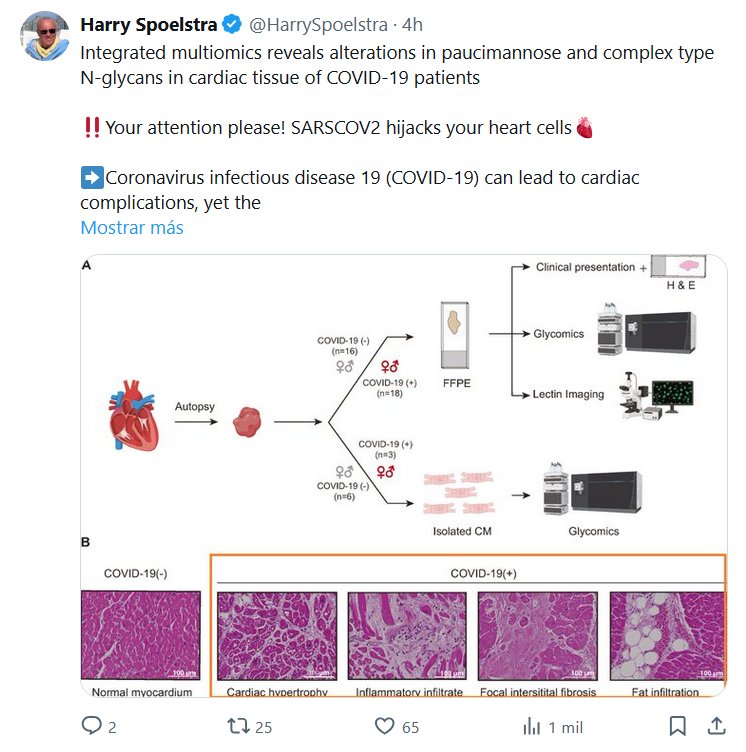 EN INGLÉS Harry Spoelstra @HarrySpoelstra La multiómica integrada revela alteraciones en la paucimanosa y los N-glicanos de tipo complejo en el tejido cardíaco de pacientes con COVID-19 ‼️¡Atención, por favor! El SARSCOV2 secuestra las células del corazón🫀 ➡️La enfermedad infecciosa por coronavirus 2019 (COVID-19) puede provocar complicaciones cardíacas