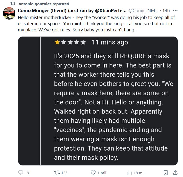EN INGLÉS antonio gonzalez reposteó ComixMonger (them!) (acct run by @XtianPerfection) [ANTE LA QUEJA DE UN VISITANTE PORQUE SE LE EXIGE MASCARILLA] Hola, señor cabrón. El «trabajador» estaba haciendo su trabajo para mantenernos a todos más seguros en nuestro espacio. Puede que pienses que eres el rey de todo lo que ves, pero no en mi lugar. Tenemos reglas. Lo siento, cariño, pero no puedes quedarte.