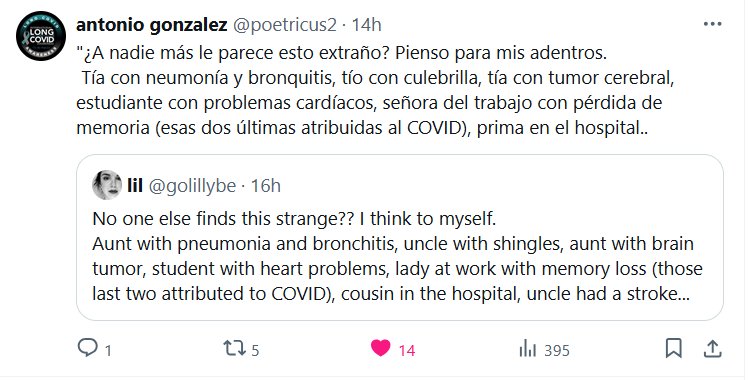 ESCUCHO VOCES QUE SON GRITOS antonio gonzalez @poetricus2 · 14h «¿A nadie más le parece esto extraño? Pienso para mis adentros. Tía con neumonía y bronquitis, tío con culebrilla, tía con tumor cerebral, estudiante con problemas cardíacos, señora del trabajo con pérdida de memoria (esas dos últimas atribuidas al COVID), prima en el hospital..