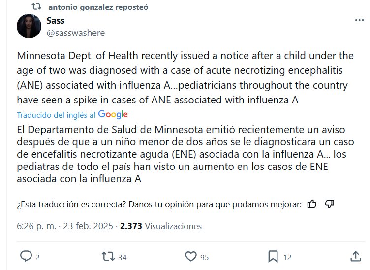 GRIPES COVIDIANAS (EN INGLÉS) El Departamento de Salud de Minnesota emitió recientemente un aviso después de que a un niño menor de dos años se le diagnosticara un caso de encefalitis necrotizante aguda (ENE) asociada con la influenza A… los pediatras de todo el país han visto un aumento en los casos de ENE asociada con la influenza A
