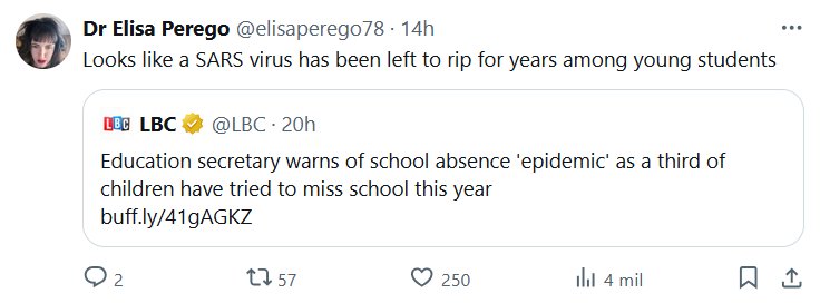 EN INGLÉS Dra. Elisa Perego @elisaperego78 Parece que el virus del SARS lleva años propagándose entre los jóvenes estudiantes Cita A LBC @LBC · El secretario de Educación advierte de una «epidemia» de absentismo escolar, ya que un tercio de los niños han intentado faltar a la escuela este año