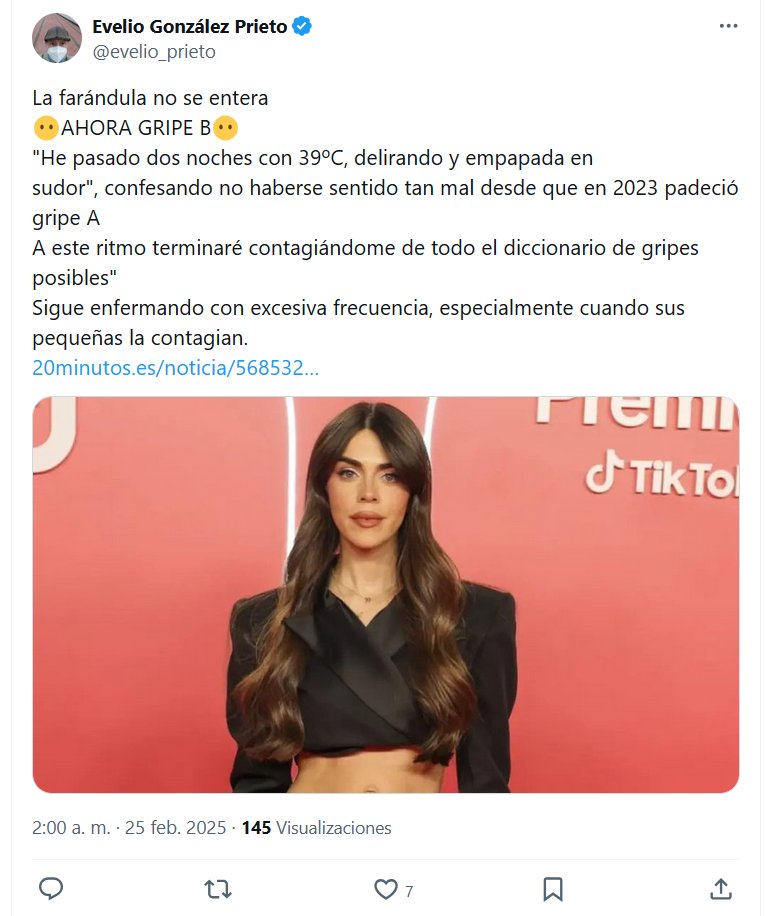 GRIPES COVIDIANAS DR. Evelio González Prieto @evelio_prieto La farándula no se entera 😶AHORA GRIPE B😶 «He pasado dos noches con 39ºC, delirando y empapada en sudor», confesando no haberse sentido tan mal desde que en 2023 padeció gripe A A este ritmo terminaré contagiándome de todo el diccionario de gripes posibles» Sigue enfermando con excesiva frecuencia, especialmente cuando sus pequeñas la contagian.