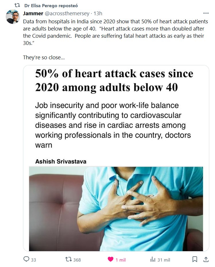 MUNDO POZO CIEGO (EN INGLÉS) Los datos de los hospitales de la India desde 2020 muestran que el 50% de los pacientes con ataques cardíacos son adultos menores de 40 años. “Los casos de ataques cardíacos aumentaron más del doble después de la pandemia de Covid. Hay personas que sufren ataques cardíacos fatales ya a los 30 años”