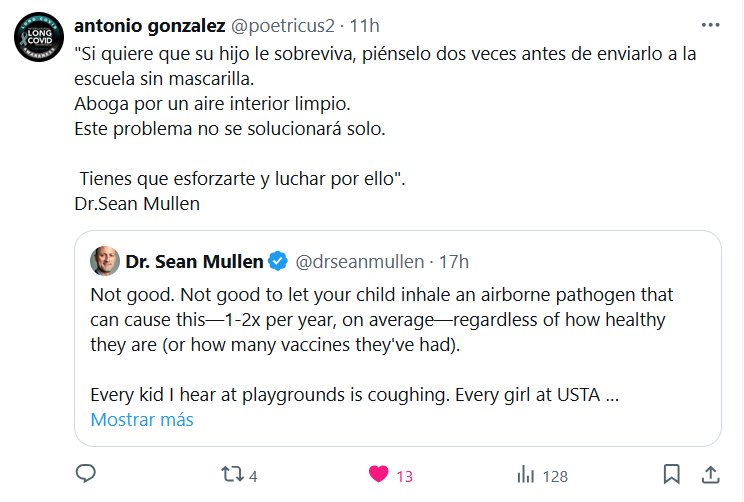 No es bueno. No es bueno dejar que su hijo inhale un patógeno transmitido por el aire que puede causar esto (una o dos veces al año, en promedio), independientemente de lo saludable que sea (o de cuántas vacunas haya recibido). Todos los niños que oigo en los parques infantiles están tosiendo. Todas las niñas en los torneos de la USTA están tosiendo. Es probable que estos niños no se identifiquen como portadores de Covid prolongado, pero la verdad es que más de un tercio de los niños del planeta lo han padecido. Muchos parecen "recuperados", pero una o dos infecciones más (ya sea SARS2, gripe u otra cosa) podrían inclinar la balanza. Los seres humanos no fueron creados para soportar infecciones crónicas y repetidas. Los niños parecen resistentes, hasta que se hace un seguimiento de sus ausencias relacionadas con la enfermedad, sus resultados en los exámenes y su rendimiento físico. Luego se considera el VOLUMEN de aire que comparten con sus compañeros de clase y las HORAS EXORBITANTES que pasan en cajas de cemento de la escuela primaria y la secundaria: aulas, vestuarios, dormitorios. Si quiere que su hijo le sobreviva, piénselo dos veces antes de enviarlo a la escuela sin un respirador. Defienda el aire limpio en espacios cerrados. Este problema no se solucionará solo. Tiene que perseverar y luchar por ello.