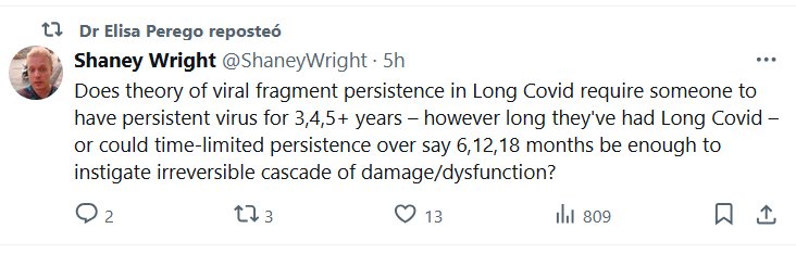 EN INGLÉS La Dra. Elisa Perego reposteó Shaney Wright @ShaneyWright ¿La teoría de la persistencia de fragmentos virales en casos de Covid prolongado requiere que alguien tenga el virus persistente durante 3, 4 o 5 años (el tiempo que haya tenido Covid prolongado) o podría ser suficiente una persistencia limitada en el tiempo de, digamos, 6, 12 o 18 meses para provocar una cascada irreversible de daños o disfunciones?