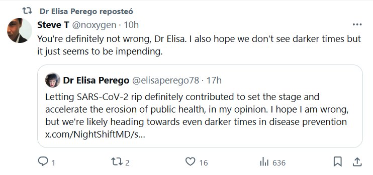 ESCUCHO VOCES (EN INGLÉS) La Dra. Elisa Perego reposteó Steve T @noxygen Definitivamente no te equivocas, Dra. Elisa. También espero que no veamos tiempos más oscuros, pero parece que se avecinan. Cita Dra. Elisa Perego @elisaperego78 En mi opinión, dejar que el SARS-CoV-2 se propague sin duda contribuyó a preparar el terreno y acelerar la erosión de la salud pública. Espero estar equivocada, pero es probable que nos encaminemos hacia tiempos aún más oscuros en la prevención de enfermedades.