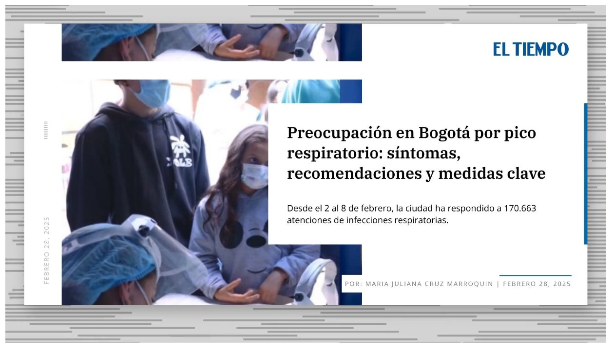 «GRIPES COVIDIANAS» Preocupación en Bogotá por pico respiratorio: síntomas, recomendaciones y medidas clave Posted on febrero 28, 2025 por coronado https://www.eltiempo.com/salud/preocupacion-en-bogota-por-pico-respiratorio-sintomas-recomendaciones-y-medidas-clave-3431173